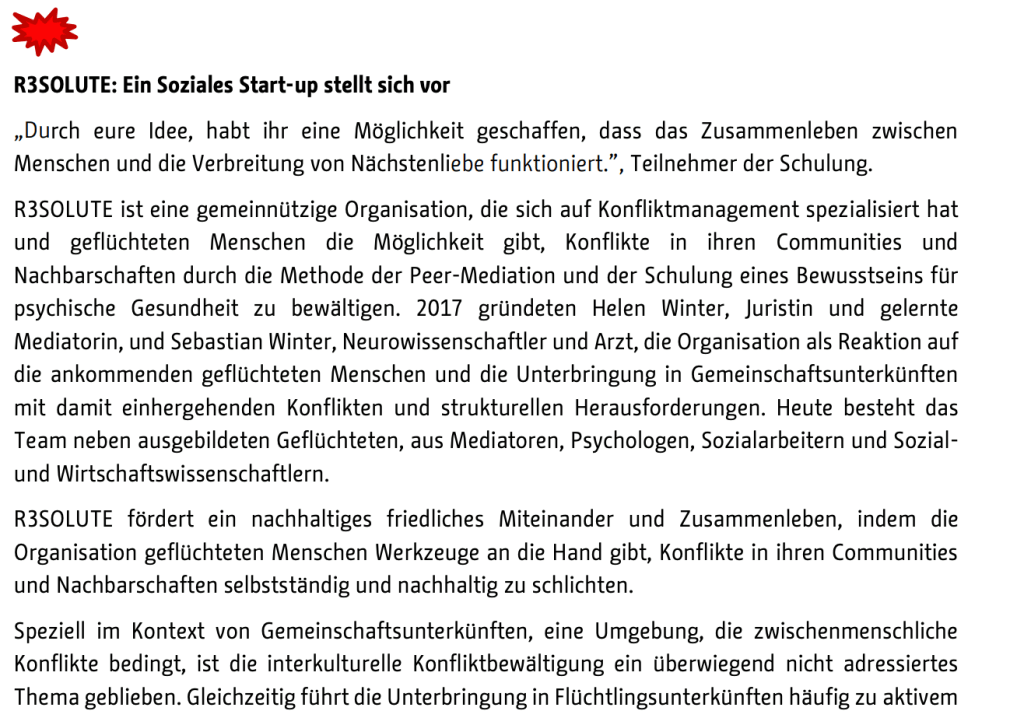 “Selbstbestimmung und mentale Gesundheit hat für das Berliner Startup „R3SOLUTE“ Priorität. Gründerin des Konfliktmanagementprojekts ist die Völkerrechtlerin Helen Winter. „Geflüchtete lernen, Konflikte zu lösen und Verantwortung zu übernehmen“, erläutert CO-Gründer Sebastian Winter, Neurowissenschaftler und angehender Arzt. Das Projekt bildet Flüchtlinge zu Mediatoren aus. Als interkulturelle Trainer helfen sie, zum Beispiel in Gemeinschaftsunterkünften Probleme zu bewältigen. Ein weiterer Schwerpunkt liegt auf der Bewältigung psychologischer Traumata der Geflüchteten.”